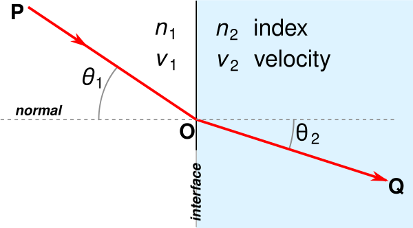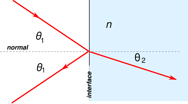 Преломление возникает, когда свет проходит через область пространства с изменённым показателем преломления; этот принцип позволяет использовать линзы для фокусировки света. Простейший случай преломления возникает, когда существует граница раздела между однородной средой с показателем преломления и другой средой с показателем преломления . В таких ситуациях закон Снеллиуса описывает результирующее отклонение светового луча: