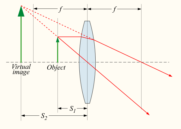 Устройство, создающее сходящиеся или расходящиеся световые лучи из-за преломления, известно как линза. Линзы характеризуются своим фокусным расстоянием: собирающая линза имеет положительное фокусное расстояние, а рассеивающая линза имеет отрицательное фокусное расстояние. Меньшее фокусное расстояние означает, что объектив имеет более сильный эффект схождения или расхождения. Фокусное расстояние простой линзы в воздухе определяется уравнением линзы[42].