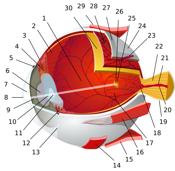 Человеческий глаз фокусирует свет на слой фоторецепторных клеток, называемый сетчаткой, который образует внутреннюю поверхность задней части глаза. Фокусировка осуществляется серией прозрачных материалов. Свет, попадающий в глаз, сначала проходит через роговицу, которая обеспечивает большую часть оптической силы глаза. Затем свет проходит через жидкость сразу за роговицей — в переднюю камеру, а затем проходит через зрачок. Затем свет проходит через линзу, которая дополнительно фокусирует свет и позволяет регулировать фокусировку. Затем свет проходит через основной объём жидкости в глазу — стекловидное тело — и достигает сетчатки. Клетки сетчатки покрывают заднюю часть глаза, за исключением места выхода зрительного нерва; это приводит к существованию слепого пятна.