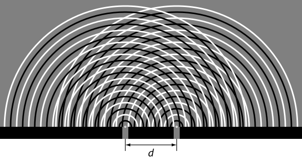 где — расстояние между двумя источниками волнового фронта (в случае экспериментов Юнга это были две щели), — угловое расстояние между центральной полосой и полосой -того порядка, где центральный максимум наблюдается при [53].