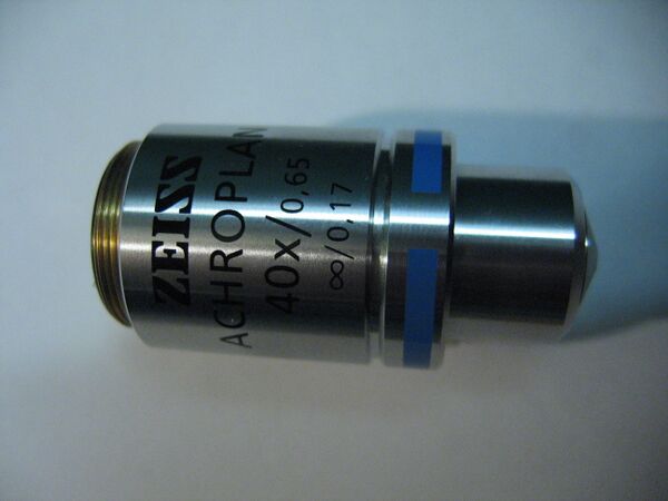 - Тип коррекции на длину тубуса микроскопа. Практически всегда это 160 или бесконечность (∞). Как правило объективы с коррекцией на бесконечность качественнее и дороже. Объективы с коррекцией на бесконечность могут применяться самостоятельно (без окуляра), что используют в безлинзовых адаптерах к фотоаппаратуре. Объективы с конечной и бесконечной коррекцией не взаимозаменяемы, оптический тракт микроскопа различается.