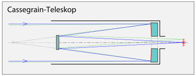 Схема была предложена Лораном Кассегреном в 1672 году. Это вариант двухзеркального объектива телескопа. Главное зеркало вогнутое (в оригинальном варианте параболическое). Оно отбрасывает лучи на меньшее вторичное выпуклое зеркало (обычно гиперболическое). По классификации Максутова схема относится к так называемым предфокальным удлиняющим — то есть вторичное зеркало расположено между главным зеркалом и его фокусом и полное фокусное расстояние объектива больше, чем у главного. Объектив при том же диаметре и фокусном расстоянии имеет почти вдвое меньшую длину трубы и несколько меньшее экранирование, чем у Грегори. Система неапланатична, то есть несвободна от аберрации комы. Имеет много как зеркальных модификаций, включая апланатичный Ричи-Кретьен, со сферической формой поверхности вторичного (Долл-Кирхем) или первичного зеркала, так и зеркально-линзовых.