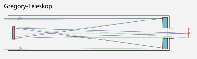 Эту конструкцию предложил в 1663 году Джеймс Грегори в книге Optica Promota. Главное зеркало в таком телескопе — вогнутое параболическое. Оно отражает свет на меньшее вторичное зеркало (вогнутое эллиптическое). От него свет направляется назад — в отверстие по центру главного зеркала, за которым стоит окуляр. Расстояние между зеркалами больше фокусного расстояния главного зеркала, поэтому изображение получается прямое (в отличие от перевёрнутого в телескопе Ньютона). Вторичное зеркало обеспечивает относительно большое увеличение благодаря удлинению фокусного расстояния[5].