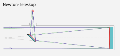 Такую схему телескопов предложил Исаак Ньютон в 1667 году. Здесь плоское диагональное зеркало, расположенное вблизи фокуса, отклоняет пучок света за пределы трубы, где изображение рассматривается через окуляр или фотографируется. Главное зеркало параболическое, но если относительное отверстие не слишком большое, оно может быть и сферическим .