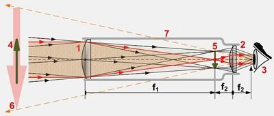 где и — фокусные расстояния объектива и окуляра соответственно. В случае использования дополнительных оптических узлов между объективом и окуляром (оборачивающих систем, линз Барлоу, компрессоров и т. п.) увеличение должно быть умножено на кратность используемых узлов.
