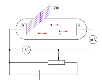 Катод освещают ультрафиолетовыми лучами через специальное кварцевое окошко, сделанное в колбе. Ультрафиолетовое излучение выбивает с катода электроны, которые разгоняются напряжением и летят на анод. Включённый в цепь миллиамперметр регистрирует электрический ток. Этот ток называется фототоком, а выбитые электроны, его создающие, называются фотоэлектронами.