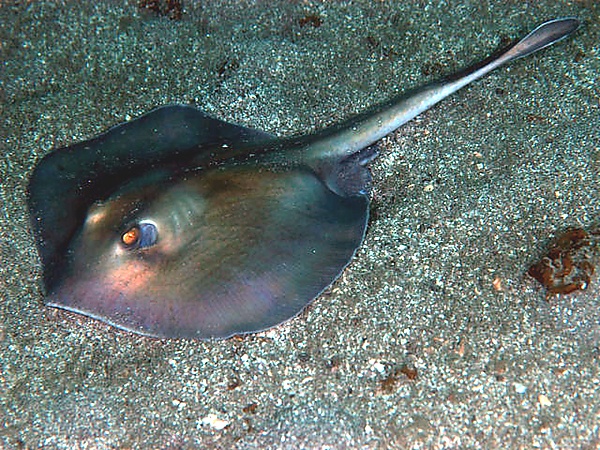 Края коротких и широких брюшных плавников заострены. Хвост сужается и переходит в длинный и низкий хвостовой плавник в виде листа. Спинные плавники отсутствуют. На дорсальной поверхности хвоста в центральной части расположен зазубренный шип. Окраска оранжевого цвета. Максимальная зарегистрированная длина 40 см[7].