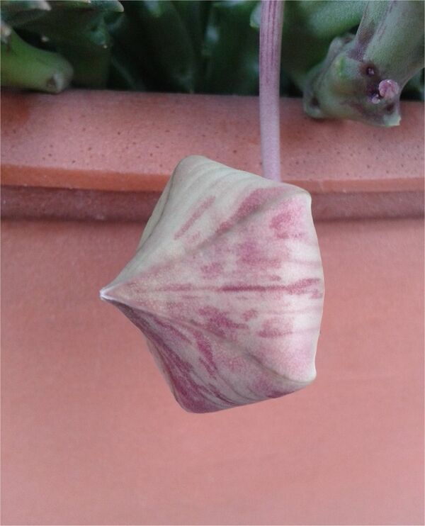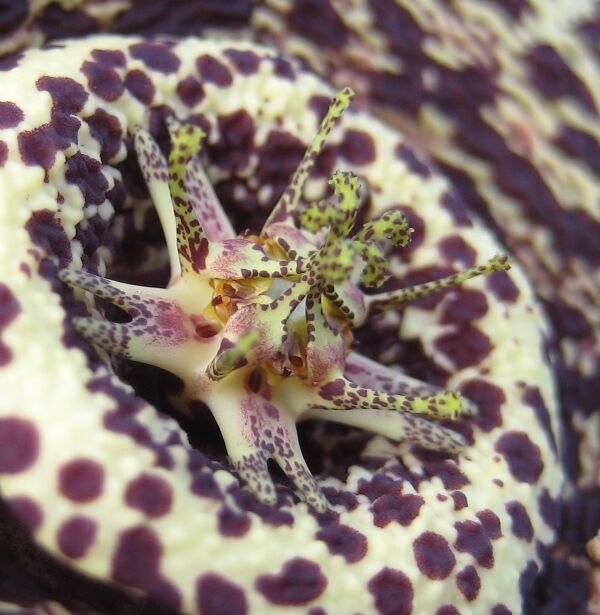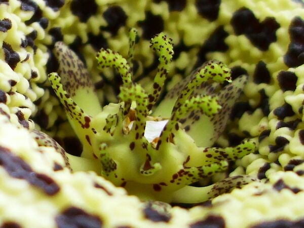 Небольшой суккулент, образующий куртину 50-200 мм (-1 м) в диаметре, не корневищный. Стебли 25-100 мм длиной, 5-10 мм толщиной (без зубцов), (коротко) полегающие, зелёные с пурпурно-коричневыми крапинками; бугорки 3-9 мм длиной, расположены рыхло в 4 тупых ряда вдоль стебля с бороздкой между рядами, сужаются в расходящиеся до восходящего конического острого зубца, часто с мелкими зубчиками по обеим сторонам у вершины. Соцветие по 1 на стебле у основания, из 1-3 цветков, развивающихся последовательно из короткого цветоноса (до ± 10 мм длиной), с несколькими мелкими шиловидными прицветниками (<1,5 мм длиной); цветоножка 20-60 мм длиной, 2-3 мм толщиной, горизонтальная, обычно с восходящей вершиной, удерживающей цветок вверх, от бледно-зелёной до розоватой с красно-фиолетовыми прожилками; чашелистики 5-8 мм длиной, 2-3 мм шириной в основании, от яйцевидных до яйцевидно-ланцетных, от острых до заострённых. Венчик 45-80 мм в диаметре, ± поворот; снаружи гладкие, бледно-кремово-зелёные с красно-фиолетовыми прожилками к концам лопастей; внутри морщинистое на кольце, поперечно морщинистое на лопастях становится почти гладким к концам, а также к основанию трубки и за краем кольца, от кремового до зеленовато-жёлтого с разнообразными пурпурно-коричневыми пятнами с меньшим количеством и более мелкими точками на кольце; трубка неглубоко чашеобразная, образована кольцом вокруг гиностегия, кольцо от пятиугольного до круглого и диаметром 18-23 мм, неглубоко чашеобразное с распространением к загнутому и более тонкому краю, с густым кольцом коротких торчащих цилиндрических щетинок в основании вокруг гиностегия; лопасти 16-25 мм длиной, 12-21 мм шириной в основании, яйцевидные, от острых до коротко заострённых, от раскидистых до слегка загнутых, края реснитчатые. Венчик ± 8 мм высотой, 12-15 мм шириной, приподнят над основанием трубки на короткой цилиндрической ножке <1 мм высотой; наружные лопасти 4-6 мм длиной, 2 мм шириной, расходящиеся восходящие, линейно-продолговатые, слегка сужающиеся к 2-3-зубчатой вершине, в центре немного толще, чем к бокам, кремовые с пурпурно-коричневыми точками (у основания более крупное пурпурно-коричневое пятно). под направляющей); внутренние лопасти 3-4 мм длиной, прижаты к спинкам пыльников, затем приподнимаются, сближенно-прямые в центре и загнуты к концам, дорзивентрально уплощённые и яйцевидные у основания, затем сужаются до почти теретных и с булавовидно-бугорчатой вершиной, при этом восходящие слегка расширяются, латерально уплощённые спинной рог длиной до 3-4 мм ниже уровня пыльников также с булавовидно-бугорчатой вершиной, кремовый с пурпурно-коричневыми точками[2].