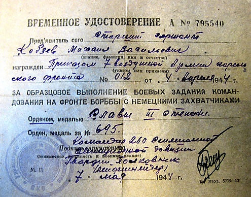 Чаще всего встречаются временные удостоверения, в которых типографским способом указана причина награждения: «За образцовое выполнение боевых заданий командования на фронте борьбы с немецкими захватчиками».
