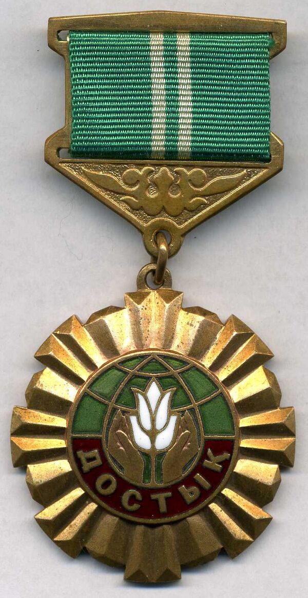- Орден «Достык» I степени состоит из звезды и знака ордена на плечевой ленте;