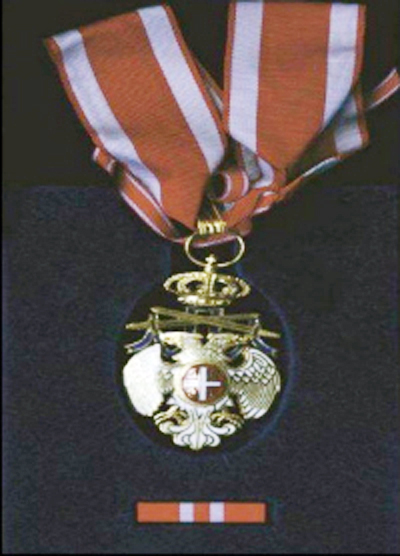Знак ордена — золотая плоская фигурка двуглавого орла белой эмали с прорисовкой золотом деталей голов, лап, перьев. На груди орла овальный медальон с красной эмали с прямым крестом белой эмали и изображениями золотых геральдических огнив по сторонам от него. За головами орла лента синей эмали, на которую наложены два перекрещенных золотых меча. Лента крепится к золотой королевской короне.
