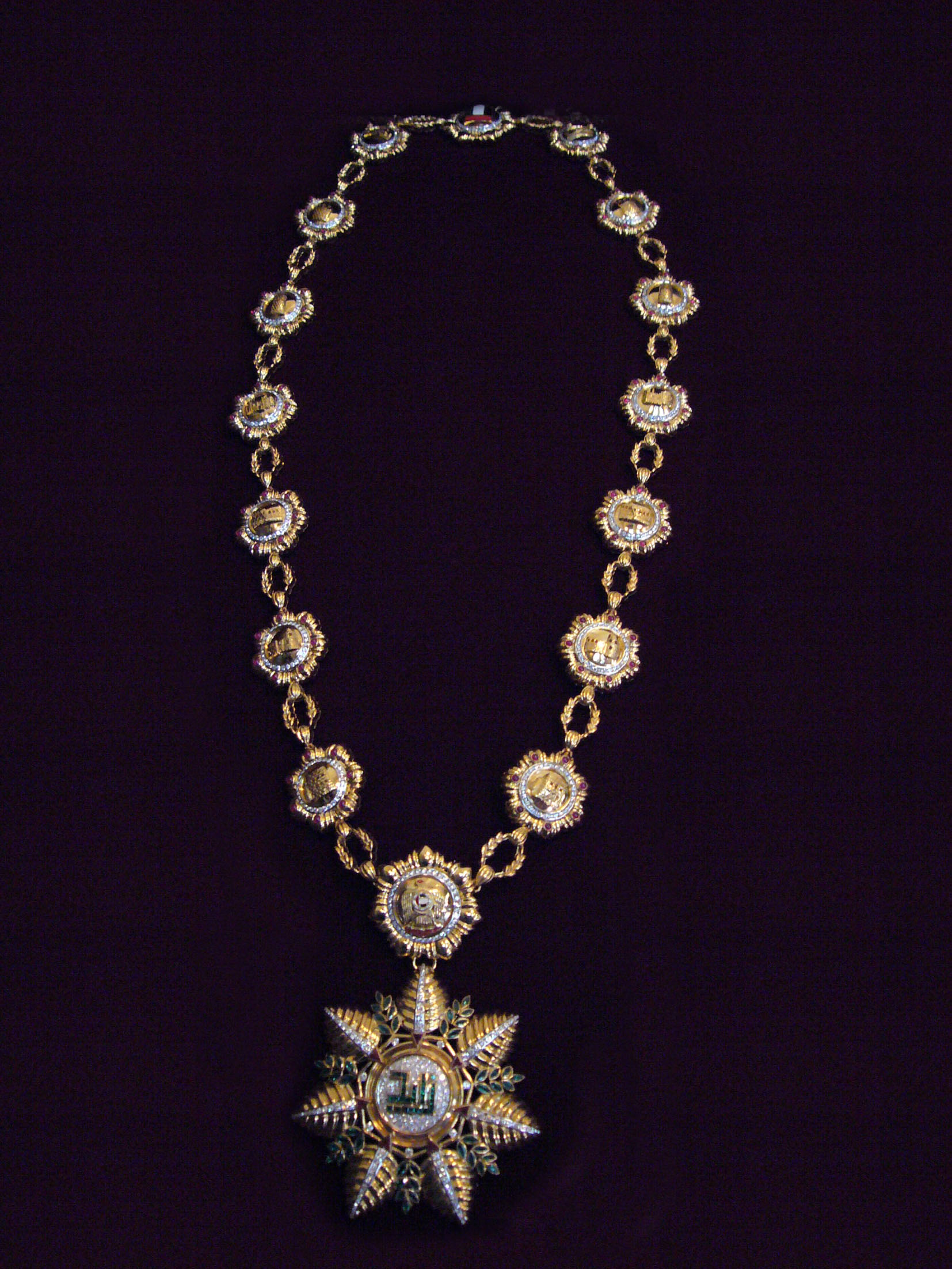 Знак ордена подвешен к золотой цепи состоящей из звеньев в виде золотых лавровых веточек, объединённых в венок, и золотых бляшек с изображениями гербов эмиратов в окружении бриллиантового кольца и декорированных рубинами. Центральное звено несёт на себе герб ОАЭ.