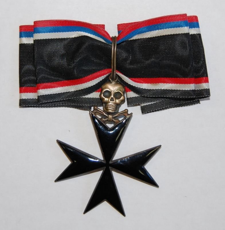 Орден 1-й степени представлял собой мальтийский крест из белого металла, который был покрыт чёрной эмалью или чёрным лаком. Над верхней стороной креста находилась мёртвая голова, под которой крест-накрест располагались две кости. Поперёк креста располагались два меча, которые отсутствовали на ордене для гражданских лиц. Оборотная сторона награды была гладкая. Крест носился на шее на чёрной ленте с каймой. С одной стороны — бело-сине-красной, а с другой — чёрно-бело-красной. При ношении на шее — германские цвета наверху, то же при ношении второй степени на груди с бантом.