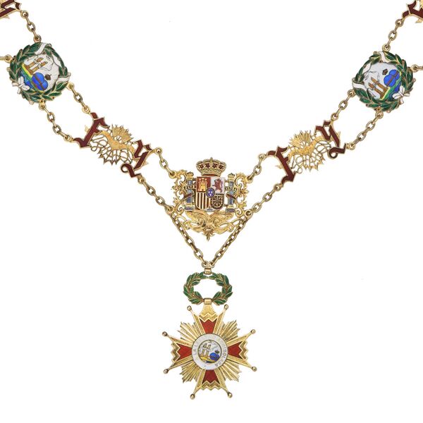 Цепь ордена: центральное звено в виде королевского герба Испании. Остальные звенья: пучок стрел с вензелем Фердинанда VII готическими буквами; центральный медальон знака ордена в лавровом венке.