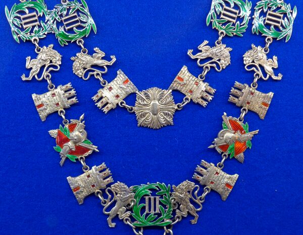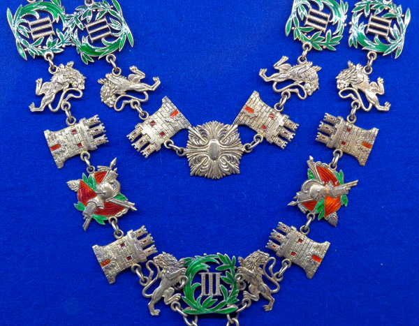 Орденская цепь состоит из звеньев, представляющих собой изображения золотых башен, львов и лаврово-пальмовых венков, окружающих римскую цифру «III».