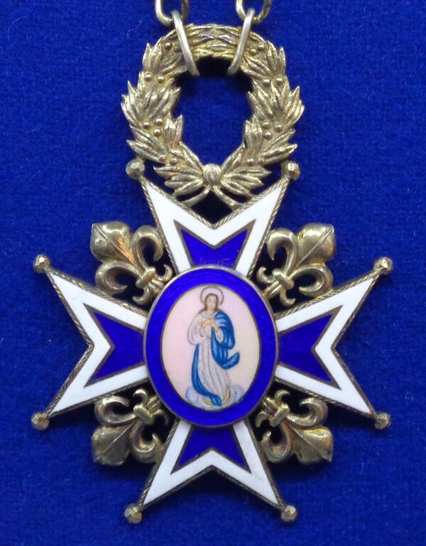 Знак ордена представляет собой мальтийский крест, в центре которого в овальном медальоне изображение Девы Марии. Лучи креста, между которыми находятся золотые королевские лилии, покрыты эмалью голубого цвета с белой каймой и имеют на концах золотые шарики. На оборотной стороне креста в центре медальона стоит римская цифра «III», указывающая на создателя ордена. Крест при помощи переходного звена в виде золотого лаврового венка подвешивается либо к орденской ленте, либо орденской цепи.