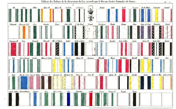 Лента — шёлковая муаровая белого цвета. Приказом от 9 мая 1814 года на ленту введена розетка из такой же ленты, а на ленте для Национальной гвардии Парижа, для отличия от Национальных гвардий прочих регионов Франции, повелено вышивать герб столицы. Указом от 5 августа 1814 года для Национальной гвардии Парижа введена новая лента — белая, с синими, шириной 2 мм, полосками по краям. Указом от 5 февраля 1816 года департаментам Франции для своих Национальных гвардий разрешено учредить свои особенные ленты. Из 86 департаментов этим правом воспользовались 74, и только у 12 лента осталась оригинальная — белая.