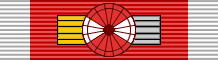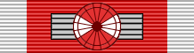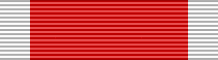 Лента ордена красного цвета с белыми полосками по краям.