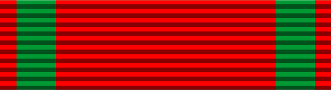 Лента — красная с узкими зелеными полосками, слегка отступающими от краев.