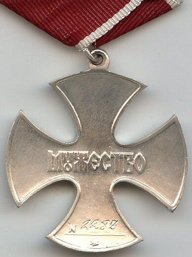 На оборотной стороне знака по горизонтали размещена рельефная надпись «МУЖЕСТВО», исполненная стилизованными буквами, а также номер знака ордена. По краю — рельефный бортик. Расстояние между концами креста составляет 40 мм[13][14].
