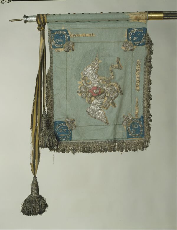 В 1806 году в Русской армии были введены наградные Георгиевские знамёна. В навершии знамени помещался Георгиевский крест, под навершием повязывалась чёрно-оранжевая Георгиевская лента со знамёнными кистями шириной в 1 вершок (4,44 см). Первые Георгиевские знамёна были выданы Киевскому гренадерскому, Черниговскому драгунскому, Павлоградскому гусарскому и двум донским казачьим полкам за отличие в кампании 1805 года с надписью: «За подвиги при Шенграбене 4 ноября 1805 года в сражении 5 тыс. корпуса с неприятелем, состоящим из 30 тыс.»