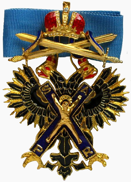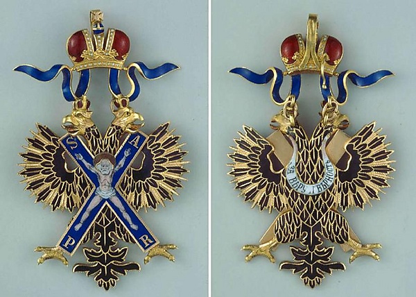 - Имеет лишь одну степень. Состоит из креста, серебряной звезды и голубой ленты через правое плечо. На концах Андреевского креста четыре латинские буквы «S.A.P.R.», что означает «Святой Андрей — Покровитель России».