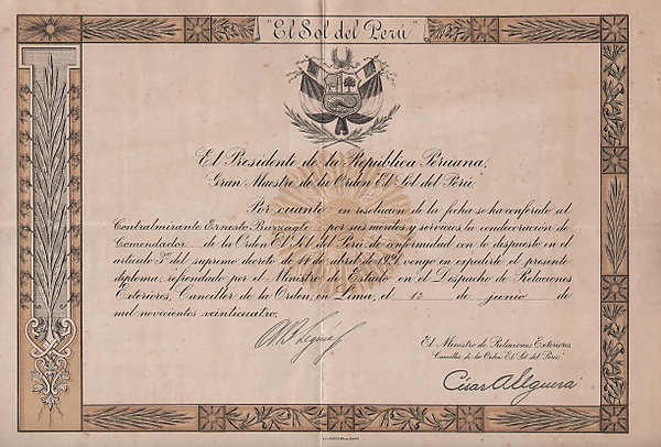 Восстановлен под названием Орден Солнца Перу в 1921 году в честь столетия обретения независимости Перу. Имел четыре степени.