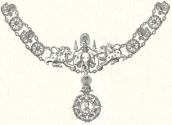 Центральное звено представляет собой изображение трёх слонов, один слон анфас, два в профиль увенчанных золотой короной с сиянием. По обеим сторонам медальона — золотые львы с королевскими зонтами.
