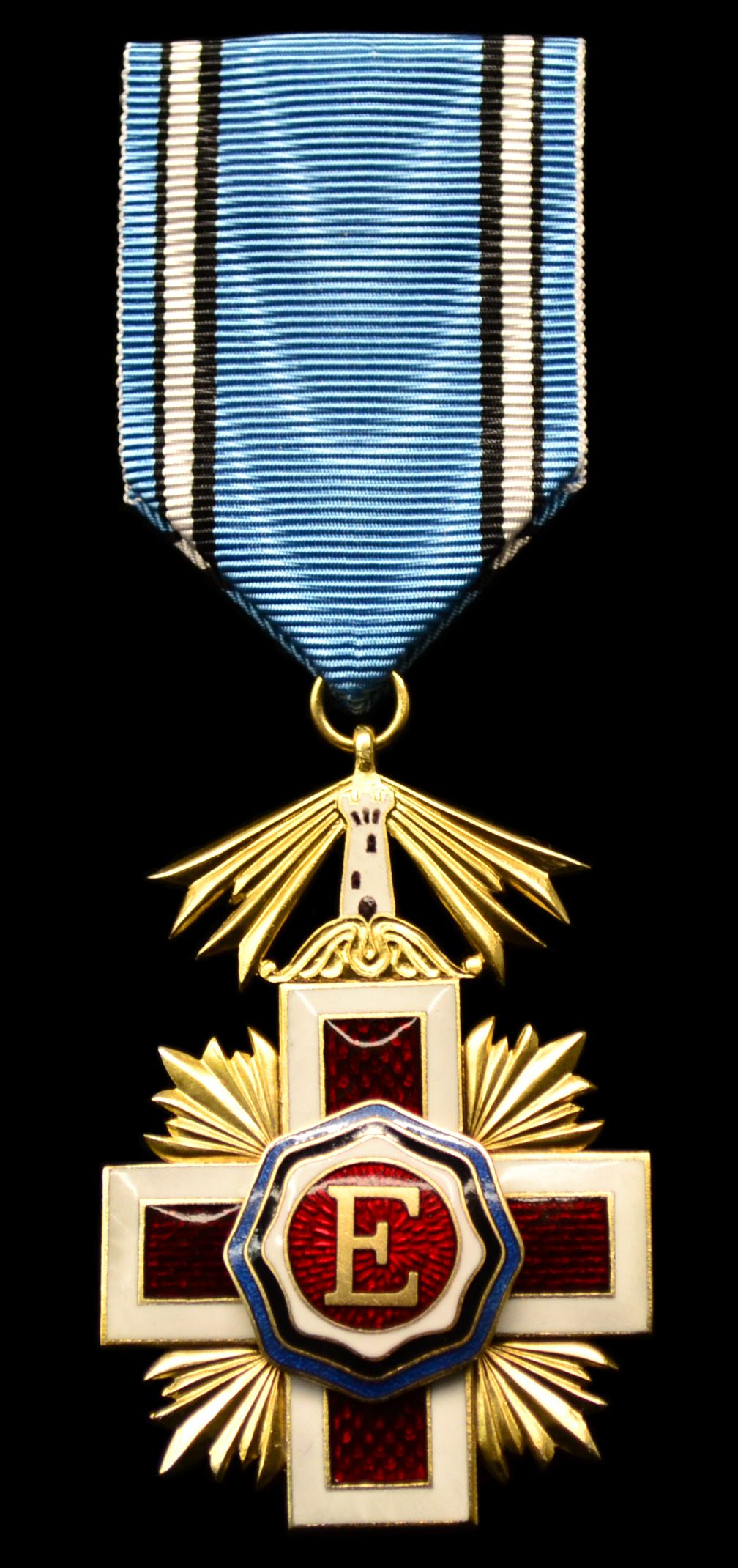 Крест — золотой прямой, 41х41 мм, тёмно-красной эмали, с белой каймой (шириной 2 мм). Между плечами креста выступающие золотые лучи. В центре креста медальон тёмно-красной эмали с большой золотой литерой «Е» в центре, окаймлённый образующими стилизованный восьмигранник (диаметром 24,5 мм) волнистыми лентами эстонских государственных цветов — синей, чёрной и белой. На оборотной стороне креста в центре круглый медальон (диаметром 22 мм) тёмно-красной эмали с широким ободком такой же эмали. В центре медальона дата — «1919», на ободке девиз Международного Общества Красного Креста — «INTER ARMA CARITAS». Над верхним плечом креста закреплена возвышающаяся над золотыми волнами зубчатая башня (маяк) белой эмали (высотой 19 мм) с ниспадающими по обе стороны золотыми лучами. К верху башни крепится кольцо, через которое знак подвешивается к орденской ленте.