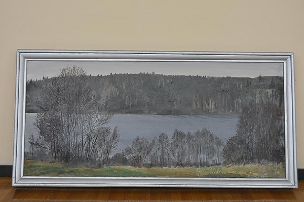 На картине представлен пейзаж реки Оредеж, протекающей в Ленинградской области. Река изображена глубокой сенью между двумя берегами: ближний берег пологий, с деревьями и кустарниками без листвы, дальний берег покрыт густым лесом с преобладанием берёз. Над лесом видна узкая полоса серого неба, что подчёркивает атмосферу уединения и спокойствия композиции.
