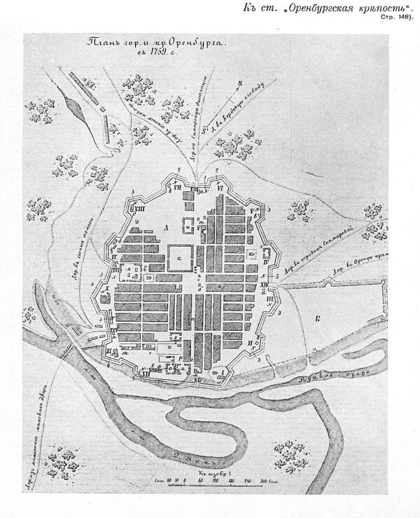 Высота крепостному валу по разным местам 12 футов, но по низким более, а по высоким менее, шириною рампар шесть сажен, глубина рва 12, а ширина 35 футов. Наружная крутость одной крепости лицует вся плитным камнем. Ширина сего города по интервалу в широком месте 570, а длина 677 сажен, считая по средине. Окружность сей фортеции, идучи по валу, сочиняет пять верст 192 сажени, а с внешней стороны четыре версты и 289 сажен, не причисляя к тому Казачей слободы, пред двумя полигонами, Преображенским и Неплюевским, застроенной, около которой, начиная от Неплюевского бастиона, положено быть по длине на 388 саженях с тремя бастиона ретраншементу с одним к реке редантом, что яснее видно на плане. Для въезда в город, и для выезда, имеется четверо ворот, называемых: первые Сакмарския, потому что состоят к стороне Сакмары реки, прямо от Губернской канцелярии по большой Губернской улице; другая Орския для того, что сквозь их лежит дорога в Орскую крепость; третьи Яицкия к реке Яику; четвертыя Самарския посему, что на Самарскую дистанцию и к городу Самаре зимняя дорога туда лежит; а к тому может причислен быть и ввоз от реки Яика на гору, где положено быть сквозь вал же пятым водяным воротам».