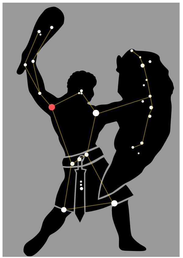 Красный сверхгигант Бетельгейзе (α Ориона), араб. «Байт Аль Джаузза» значит «Рука Центрального» (искажённая форма привела к распространению толкования «подмышка») — неправильная переменная звезда, блеск которой изменяется от 0,2 до 1,2 звёздной величины и в среднем составляет около 0,7m. Расстояние до звезды от Земли составляет 650 световых лет, а светимость в 14 000 раз больше солнечной. Это одна из крупнейших среди известных астрономам звёзд: если бы её поместили вместо Солнца, то при минимальном размере она заполнила бы орбиту Марса, а при максимальном — достигала бы орбиты Юпитера. Объём Бетельгейзе по крайней мере в 160 млн раз больше солнечного.