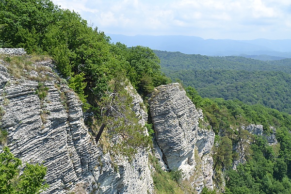Абсолютно вертикальные обрывы высотой 125 метров над уровнем реки и 379 метров над уровнем моря, покрытые светлым известняком и жёлтым песчаником. На их вершинах растут сосны, дубы, грабинники. В окрестностях Орлиных скал известно несколько карстовых пещер, самая крупная из них находится на глубине 15 метров.