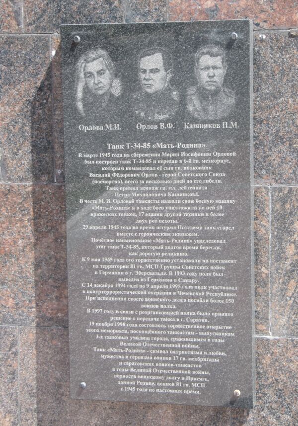 14 марта 1945 года командир 6-го гвардейского мехкорпуса гвардии полковник В. Ф. Орлов в торжественной обстановке получил от командующего 4-й гвардейской танковой армией генерал-полковника Д. Д. Лелюшенко танк Т-34, построенный с разрешения Верховного Главнокомандующего на средства матери комкора Марии Иосифовны Орловой и сразу же получивший от танкистов название «Мать-Родина». Танк был передан лучшему экипажу 126-го танкового полка 17-й гвардейской мехбригады в составе: командир танка младший лейтенант М. П. Кашников, командир орудия сержант Анферов, механик-водитель сержант Остапенко, радист-пулемётчик сержант Левченко, заряжающий сержант Коробейников (по другим данным командир танка П. М. Кашников, механик-водитель В. Н. Чепик, командир орудия П. Ф. Балакшей, заряжающий В. С. Кириенко, радист-пулемётчик И. М. Левченко).