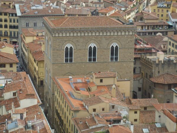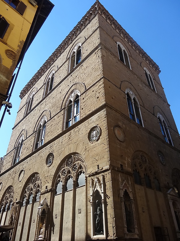 Здание пострадало от пожара в 1304 году. В 1337 году его перестраивали в типично тосканском «готически-ренессансном стиле» Франческо Таленти, Нери ди Чьоне и другие мастера, работавшие в то время на строительстве флорентийского Собора. Они надстроили третий этаж, замуровали арки лоджии первого этажа, а их верхние полукружия — люнеты — заполнили ажурной и рельефной готической резьбой. По венчающему карнизу расположены характерные для средневековой итальянской архитектуры арочки-машикули. В 1380—1404 годах нижний этаж служил церковью Св. Девы Марии и Св. Анны[2]. Дальнейшие перестройки, включая создание больших арочных венецианских окон второго этажа с беломраморными наличниками, ажурным резным орнаментом и колонками посередине, осуществлял Бернардо Буонталенти[3].