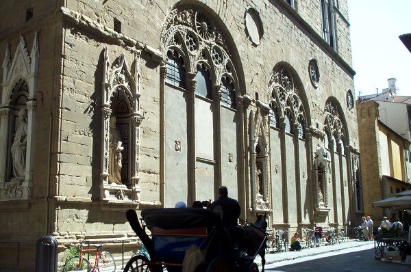 В 1406 году по постановлению флорентийской Синьории ремесленные цехи города в течение десяти лет должны были украсить четырнадцать ниш всех четырёх фасадов здания статуями своих небесных покровителей. В 1414 году Гильдия торговцев тканями «Arte di Calimala» заказала Лоренцо Гиберти бронзовую статую Иоанна Крестителя, скульптор Андреа Верроккьо в 1467—1483 годах создал для гильдии рынка скульптурную группу Христа и Святого Фомы. Фигуру Святого Петра из мрамора по заказу цеха мясников в 1415 году выполнил Филиппо Брунеллески. Никколо ди Пьеро Ламберти для Гильдии судей и нотариусов создал статую Святого Луки (1404—1406) и по заказу Гильдии меховщиков и кожевников — Святого Иакова (ок. 1415 г.; на южном фасаде здания). Позднее, в 1597—1602 годах Джамболонья для гильдии судей создал свой вариант фигуры Святого Луки из бронзы. Оригиналы статуй ныне находятся на втором этаже церкви, превращённом в музей, и в музее Барджелло, а на фасадах установлены копии.