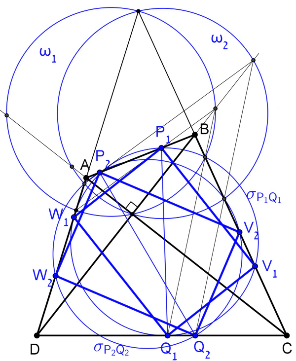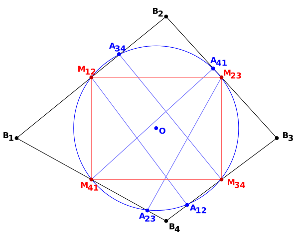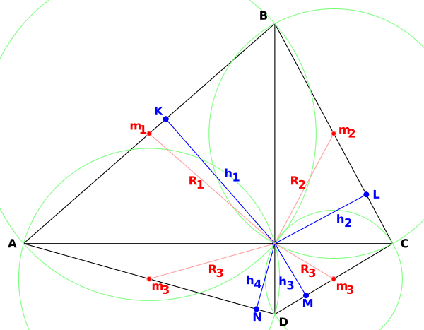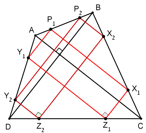 где P — точка пересечения диагоналей. Из этого равенства следует почти немедленно, что диагонали выпуклого четырёхугольника перпендикулярны также тогда и только тогда, когда проекции пересечения диагоналей на стороны четырёхугольника являются вершинами вписанного четырёхугольника[5].
