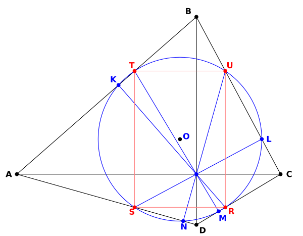 Если нормали к сторонам выпуклого четырёхугольника ABCD через пересечение диагоналей пересекают противоположные стороны в точках R, S, T, U, а K, L, M, N — основания нормалей, то четырёхугольник ABCD ортодиагонален тогда и только тогда, когда восемь точек K, L, M, N, R, S, T и U лежат на одной окружности, второй окружности восьми точек. Кроме того, выпуклый четырёхугольник ортодиагонален тогда и только тогда, когда четырёхугольник RSTU является прямоугольником, стороны которого параллельны диагоналям четырёхугольника ABCD[5].