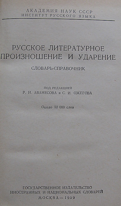 - Русское литературное произношение и ударение. Словарь-справочник / Под ред. Р. И. Аванесова и С. И. Ожегова. — М.: Государственное издательство иностранных и национальных словарей, 1959. — 708 с.
