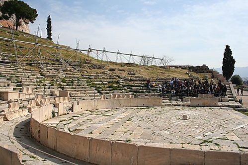 Сзади орхестры на некотором расстоянии возводилась скена (сначала — палатка для переодевания, затем выполняла функции сценического задника). Орхестру полукругом огибали сиденья для зрителей, сначала деревянные, потом — каменные. Первый ряд — проэдрия — предназначался для наиболее почтенных афинских граждан и не отгораживался от орхестры.