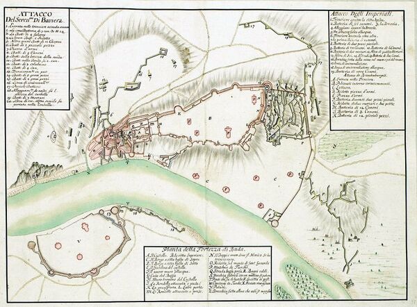 Через пять дней после открытия траншей имперцы под командованием принца Нейбургского и фельдмаршал-лейтенанта Шарля Луи де Суше штурмовали нижнюю часть города, обращенную к Вене, и овладели ею (24 июня). Затем швабы сумели продвинуться вперед и заняли гору, названную в их честь Швабенбергом[9]. 13 июля Карл Лотарингский на своем участке предпринял второй штурм: три колонны, под командованием Гвидо фон Штаремберга, графа Герберштейна и графа Ауэршперга, каждая численностью 3 тыс. человек, бросились на приступ, но наткнулись на упорную оборону и были отражены с большими потерями. Много командиров было ранено, а графы Герберштейн и Куфштейн убиты. Герцога обвиняли в излишней спешке и плохом обеспечении операции. 16 июля баварцы овладели сильно укрепленным рвом противолежащего бастиона; в этом бою погиб граф Фонтен с 35 добровольцами, а фельдмаршал-лейтенант граф д’Аспремон был тяжело ранен[7].