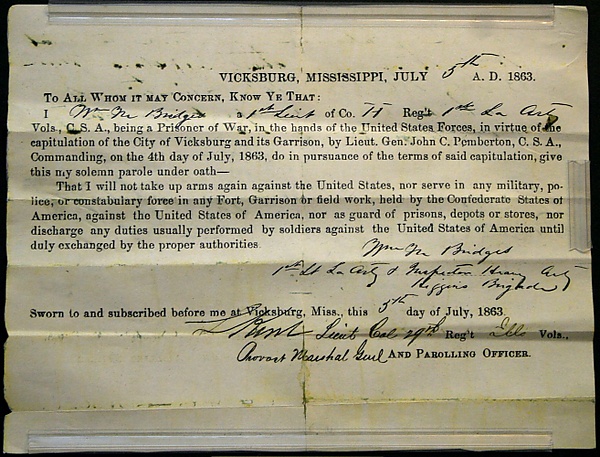 Рано утром 4 июля гарнизон во главе с Пембертоном вышел из-за укреплений Виксберга и сложили оружие к ногам победителей. В плен попало 29 тысяч 511 солдат и офицеров конфедерации.