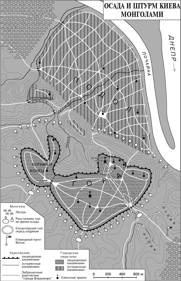 Согласно описанию Плано Карпини, монголы при взятии городов полностью оцепляли их. При этом они изматывали обороняющихся, не прекращая подступов к городу, чередуя наступающие отряды. Параллельно осадные машины монгол (пороки) планомерно день и ночь били по стенам, разрушая их. Хотя укрепления Киева были весьма внушительными, они были сооружены в XI веке, в эпоху, когда крепости брались или внезапным набегом, или длительной пассивной осадой. На сопротивление штурму с применением осадных машин киевские укрепления рассчитаны не были.