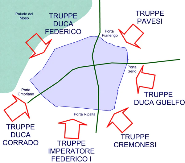 В 1158 году император Священной Римской империи Фридрих Барбаросса привёл армию в северную Италию, чтобы ограничить автономию её коммун. Главный союзник империи, Кремона, в это время ссорился с соседней Кремой из-за прав и привилегий, в частности, причитающихся епископам Кремоны. Крема также была союзницей Милана, и это рассматривалось как угроза расширения миланской власти в направлении Кремоны и реки По. На встрече, состоявшейся в Казале-Монферрато, кремонцы убедили Фридриха атаковать Крему, а также заплатили ему 15 000 серебряных крон в обмен на его помощь.
