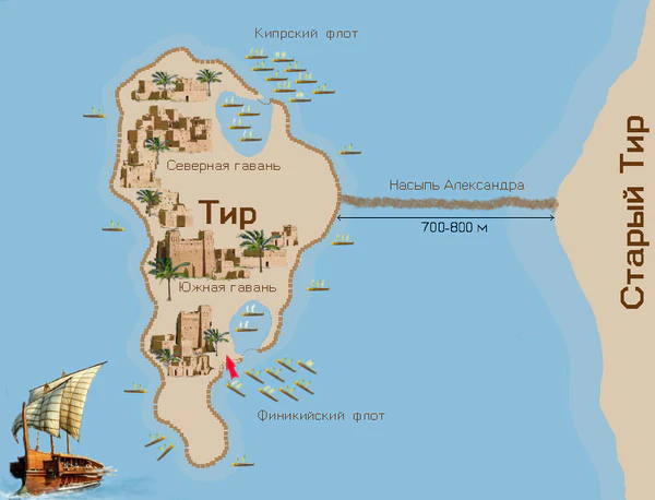 Александр распорядился о строительстве новой насыпи, шире прежней, а сам отправился в Сидон собирать свой флот, без которого осада Тира выглядела безнадёжной.