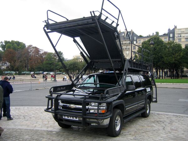 - На принципе, схожем со средневековыми штурмовыми башнями, создано несколько современных машин, предназначенных для облегчения доступа штурмующих на верхние этажи зданий. Примером может служить имеющаяся в распоряжении Группы вмешательства французской жандармерии (GIGN) специальная штурмовая машина на базе автомобиля Chevrolet Suburban 4x4 (на илл.)