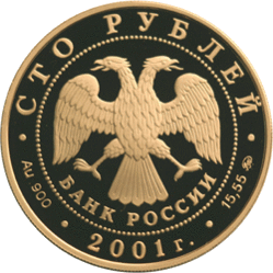 - Монета из золота 900 пробы номиналом 100 рублей тиражом 1 000 штук.