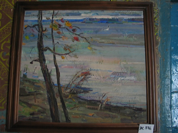 На переднем плане слева изображены два небольших деревца, справа находится поверхность воды. Верхняя часть полотна занята небом с широкой сине-белой полосой, подчёркивающей горизонтальную композицию пейзажа.