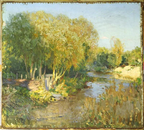 На полотне представлен осенний пейзаж в ясную солнечную погоду. Композиция строится вокруг небольшого русла реки, в центре картины. На первом плане справа изображён низкий берег, покрытый высокой бурой травой. Слева на втором плане расположен слегка возвышенный противоположный берег с высокими и пышными деревьями, за которыми виднеется изгородь и деревянная купальня со спускающимися к воде ступенями. На дальнем плане справа показан высокий песчаный берег и густые заросли кустов и деревьев. В работе преобладает зеленовато-охристая цветовая гамма, небо написано светло-голубыми тонами с несколькими небольшими облаками у горизонта.