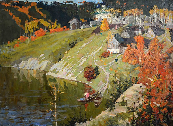 На картине изображён пейзаж ранней осени. В центре композиции — холм, покрытый блеклой зеленью травы, которая спускается слева к водоёму. На вершине холма расположены деревянные дома с островерхими крышами и группы тонких берёз с жёлтой листвой. За холмом виднеется тёмный массив леса, в котором проглядывают жёлтые пятна листвы. У крутого берега стоят две лодки, и с одной из них женщина полощет бельё.